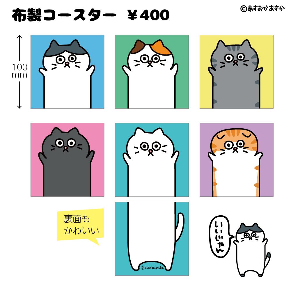 のび猫布製コースターは、可愛いレ猫のイラストが描かれたコースターです。布製なので、テーブルを傷つける心配がなく、布は少し目が荒いので滑り止め機能も備えています。
